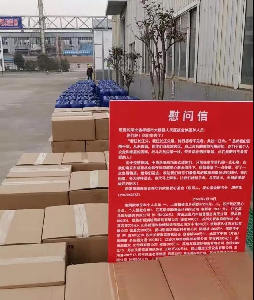 連雲港新江環保向贛榆區紅十字會捐款五萬,向贛榆區城管局環衛所捐贈五噸消毒液。